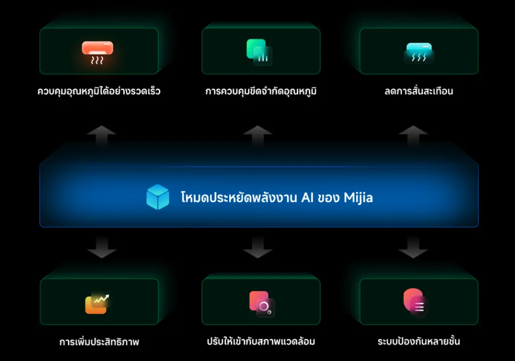 โดยโหมดประหยัดพลังงาน Mijia Al ที่สามารถเรียนรู้และปรับความเย็นอย่างชาญฉลาด ช่วยควบคุมอุณหภูมิได้เสถียรกว่าโหมดประหยัดพลังงานแบบดั้งเดิม และยังมีโหมดวัตต์ต่ำ ที่ช่วยให้ผู้ใช้เปิดเครื่องใช้ไฟฟ้าหลายเครื่องพร้อมกันได้