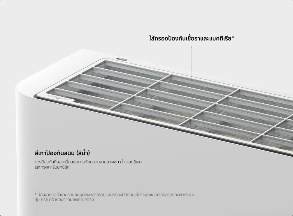 เครื่องปรับอากาศรุ่นนี้ มาพร้อมการป้องกันความชื้นและการกัดกร่อน โดยใช้วัสดุป้องกันการกัดกร่อนที่ทำจากไททาเนียมขาว ที่เป็นของเหลวที่ช่วยป้องกันการกัดกร่อนจากสารต่างๆ เช่น น้ำ ออกซิเจน และกรดคาร์บอกซิลิก ทำให้เครื่องมีความทนทานมากยิ่งขึ้นในสภาพแวดล้อมที่มีความชื้น และยังมีตัวกรองป้องกันเชื้อราและแบคทีเรีย ที่ช่วยเพิ่มคุณภาพอากาศให้ดีมากยิ่งขึ้น พร้อมด้วยฟังก์ชันทำความสะอาดตัวเองซึ่งจะช่วยป้องกันการสะสมของการเกิดน้ำแข็งและละลายออกอย่างรวดเร็ว ยิ่งไปกว่านั้นตัวอุปกรณ์ยังมีระบบแจ้งเตือนให้ทำความสะอาดตัวกรองผ่าน แอป Xiaomi Home