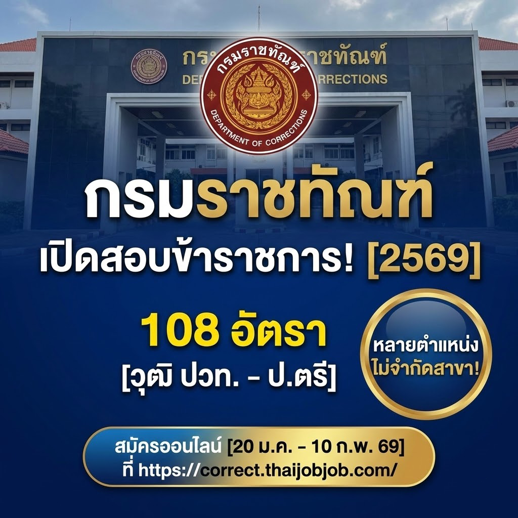 กรมราชทัณฑ์ ประกาศรับสมัครสอบแข่งขันเพื่อบรรจุและแต่งตั้งบุคคลเข้ารับราชการ ครั้งใหญ่ประจำปี 2569 รวมทั้งสิ้น 108 อัตรา เปิดโอกาสให้ผู้ที่มีวุฒิการศึกษาตั้งแต่ระดับประกาศนียบัตรวิชาชีพเทคนิค (ปวท.), ประกาศนียบัตรวิชาชีพชั้นสูง (ปวส.) และปริญญาตรี ในหลากหลายสาขาวิชา เข้าร่วมเป็นส่วนหนึ่งของงานราชทัณฑ์ (ต้องผ่านภาค ก. ของ ก.พ. ตามระดับวุฒิที่สมัคร) สมัครทางอินเทอร์เน็ตตั้งแต่วันที่ 20 มกราคม – 10 กุมภาพันธ์ 2569